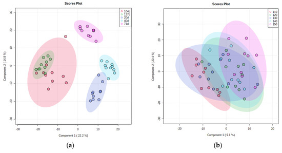 Conversely, the beta diversity of the straw flora appeared more clearly zoned at different return times (Figure 5a), with 20 and 40 d of the return being closer together, 71 and 104 d being closer together, and 137 d of the return being further apart from the other return times. The beta diversity of the three treatments with 110–130 kg hm−2 of the N application showed more obvious partitioning, and the treatments with a high N application (140 kg hm−2, 150 kg hm−2) had more similar decomposing microflora (Figure 5b). There was clear zoning of beta diversity of straw-degrading bacteria at different return depths (Figure 5c).