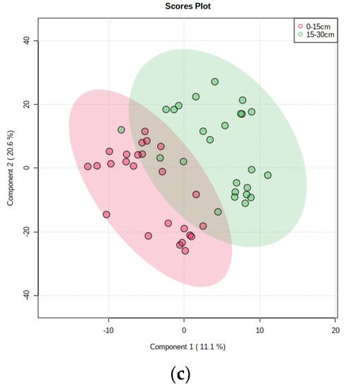 β diversity analysis based on PLS-DA. (a) Time of straw return, (b) N application management grouping, (c) different return depths.