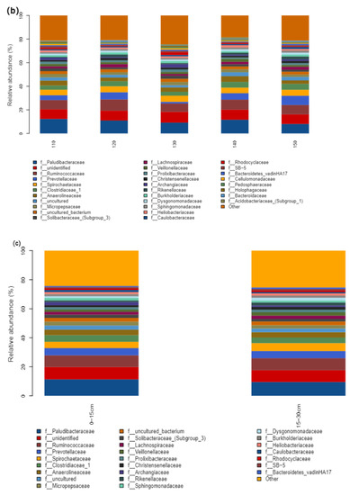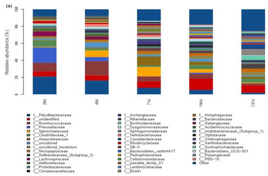 Paludibacteraceae and Ruminococcaceae of Firmicutes were the dominant bacterial genera in the straw degradation process. The abundance of Paludibacteraceae decreased gradually with time in the early stage (20–71 d), and the abundance of Caulobacteraceae increased gradually in the late stage of straw degradation (104–137 d) (Figure 6a). Under a low N application (110–130 kg hm−2), Paludibacteraceae showed a decreasing trend with the increasing N application, while the abundance of unidentified gradually increased, and under a high N application (140–150 kg hm−2), the abundance of Paludibacteraceae gradually decreased with the increasing N application. The abundance of Prevotellaceae, Spirochaetaceae, and Clostridiaceae-1 gradually increased (Figure 6b). The abundance of Paludibacteraceae and Clostridiacea-1 showed a decreasing trend with an increasing depth of field return, and the relative abundance of Spirochaetaceae gradually increased (Figure 6c).