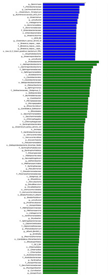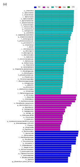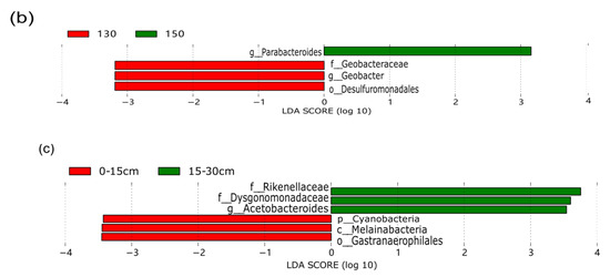 The LEF Se analysis for different lengths of return to the field yielded a total of 328 differential flora for each treatment (Figure 7). In the middle and late stages of straw decomposition, the longer the return time, the more microbial groups were significantly different, with 37 different groups at 20 d (1 at phylum level, 4 at phylum level, 4 at order level, 10 at family level, 14 at genus level, 4 at species level); 18 at 40 d (2 at phylum level, 2 at order level, 2 at order level, 2 at family level, 8 at genus level, 2 at species level); 41 at 71 d (3 at the phylum level, 3 at the order level, 9 at (2 at phylum level); 41 at 71 d (3 at phylum level, 3 at phylum level, 9 at order level, 11 at family level, 11 at genus level, 4 at species level); 52 at 104 d (5 at phylum level, 7 at order level, 11 at order level, 18 at family level, 9 at genus level, 2 at species level); 180 at 137 d (8 at the phylum level), 14 at (35 at the phylum level, 35 at the order level, 48 at the family level, 65 at the genus level, and 10 at the species level). The bacterial community structure was influenced by the amount of nitrogen applied, with significantly different communities at both 130 kg hm−2 and 150 kg hm−2, with Parabacteroides being the dominant group at the genus level for the 150 kg hm−2 treatment, while Geobacteraceae (family level), Geobacter (genus level) and Desulfur Geobacteraceae (family level), Geobacter (genus level) and Desulfuromonadales (order level) were the significantly different microbial groups for the 130 kg hm−2 N treatment. Straw-decomposing bacteria were significantly affected by different depths of return, where Cyanobacteria, Melainabacteria, and Gastranaerophilales were significant groups at 0–15 cm depth of return, while Rikenellaceae, Dysgonomonadaceae, and Gastranaerophilales were significant groups in the 15–30 cm soil layer. Dysgonomonadaceae, and Acetobacteroides were the dominant groups, and the LDA value of Rikenellaceae was the largest.