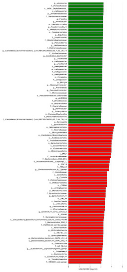 Linear discriminant analysis (LDA) effect size (LEf Se) was used to determine the main phylotypes of bacterial communities under straw return time, fertilizer application management, and return depth. (a) Straw return time, (b) N application management groups, (c) different return depths; the graphs show species with different LDA scores ≥2, i.e., statistically different biomarkers show species with significantly different abundance in different groups; the length of the bar graph represents the effect size of the significantly different species.
