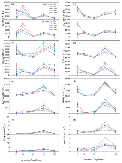 Changes in the activities of eight extracellular enzymes in different soil layers during the experimental period. Vertical bars indicate the standard error of the mean (n = 3). (a) Change in αG activity; (b) change in βG activity; (c) change in CBH activity; (d) change in βX activity; (e) change in LAP activity; (f) change in NAG activity; (g) change in Phox activity; (h) change in Perox activity.