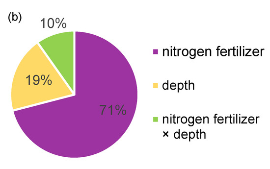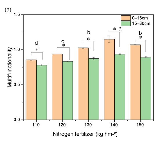 A two-way ANOVA showed that the fertilizer application regime had a greater effect on soil multifunctionality compared to the depth of return, explaining up to 71% of the variation in soil multifunctionality (Figure 9b). N application significantly affected soil potential functionality, which increased with the increasing N application (110–140 kg hm−2) and was significantly higher in each soil layer at 140 kg hm−2 than in the other treatments, before decreasing at 150 kg hm−2; however, it was still significantly higher than that in the 110–130 kg hm−2 treatments (Figure 9a). The depth of return explained 19% of the variation in soil multifunctionality (Figure 9b), while the same functional variation was observed in different soil layers in response to the N application, and the functional index was significantly higher in the surface soil (0–15 cm) than in the lower soil (15–30 cm) at the same N application (Figure 9a).