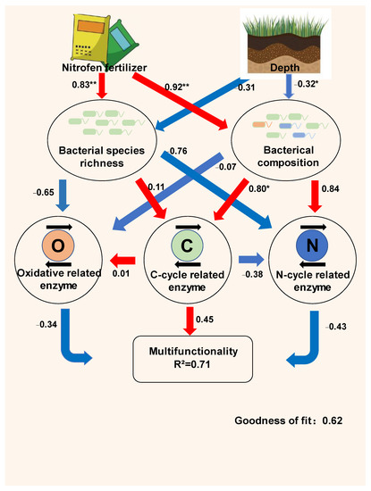 Relationship between different factors on soil multifunctionality. The numbers adjacent to the arrows indicate coefficients. The red and blue lines indicate positive and negative relationships, respectively. R2 indicates the proportion of explained variance. The mean method was used to calculate the multifunctionality of the soil. * p < 0.05, ** p < 0.01.