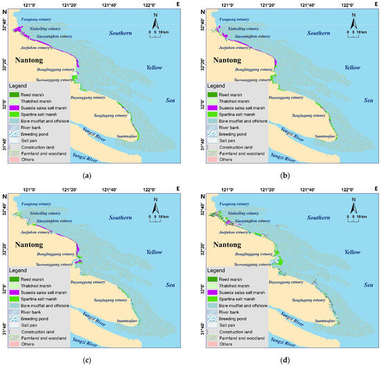 Coastal systems and wetlands provide an important portion of global ecosystem services [1]. Coastal wetlands are located in the staggered transition zone between terrestrial ecosystems and marine ecosystems, and have important ecological, economic, and scientific value (valued as being up to USD 194,000 ha−1 yr−1) [2]. Coastal wetlands not only have rich biodiversity and high productivity but also provide important services that cannot be replaced by other ecosystems, such as carbon sequestration [3], environmental purification [4], climate regulation [5], flood resistance [6], and biodiversity conservation [7]. However, they are also vulnerable areas that are being rapidly lost under the dual pressures of rising sea levels and high-intensity human activity [8,9,10]. Previous studies have shown that 16.02% of tidal flats were lost from 1984 to 2016, mainly due to human reclamation activities [11]. Human activities have greatly changed the landscape patterns and land-use types of coastal wetlands [12,13]. The coastal wetlands in Jiangsu Province are notable in the Asian continental margin as having the most typical tidal flats developed offshore. However, with rapid economic development, terrestrial areas have notably increased, and large areas of coastal wetlands have decreased [14,15]. In order to utilize coastal wetland resources more rationally, it is necessary to explore management strategies of the sustainable utilization of coastal wetlands by tracking the history of these coastal wetlands.