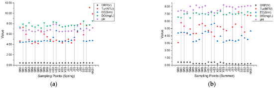 The study area is generally characterized by high water temperatures in summer and low water temperatures in winter. Combined with Figure 2 and the results presented by the data, the temporal and spatial differences in turbidity (Tur) and electrical conductivity (EC) in the study area were significant. The pH of the water bodies in the study area fluctuated significantly more in spring and summer than in autumn and winter, and the values increased significantly in summer. The spatial and temporal variability of dissolved oxygen (DO) in the water bodies of the study area was greatest in summer. The redox potential (ORP) also produced significant fluctuations and differences during the summer months.
