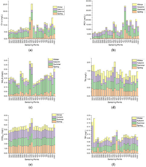 Stacked bar charts of the spatial and temporal distribution of water environmental factors: (a) Chl-a; (b) PCY; (c) NH3-N; (d) TN; (e) CODMn; (f) TP.