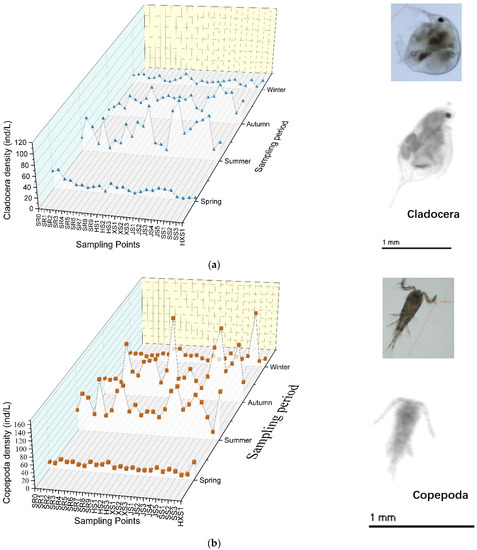 Previous research has focused more on zooplankton as indicators of water quality and for ecological assessment [19]. The formation of clusters between zooplankton and water environmental factors could be of interest in the future for ecological restoration and environmental monitoring. Similar to the results of other related studies [59,72], the nutrient levels in the study area were lower in spring than in summer and autumn, and levels of the water environment factors PCY and Chl-a, which measure biological indicators, were low in spring, suggesting that the primary producers, picocyanobacteria, as well as other algae, were less abundant in the water column. Tur, also a measure of suspended matter in the water column [65], was lower in spring than in other seasons, suggesting that the low levels of suspended particulate matter and organic detritus, in the water column limited the food sources of Copepoda and Cladocera, thus making differences in zooplankton abundance on a spatial scale less pronounced in spring.