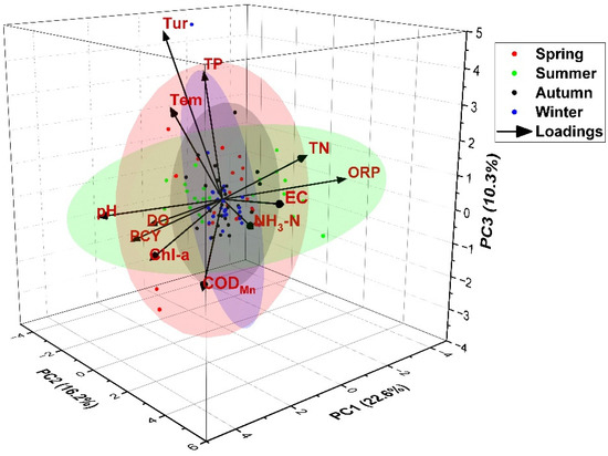 Due to the large number of water environmental factors involved in this study, in order to facilitate the study of the response relationship between water environmental factors and zooplankton, after using the KMO (Kaiser-Meyer-Olkin) test for judgement (0 < 0.735 < 1), the dimensionality of the water environmental factors could be reduced using principal component analysis [55,56], and the loadings plot for the principal component analysis and the ellipses corresponding to the four 95% confidence levels for spring, summer, autumn and winter are shown in Figure 5.