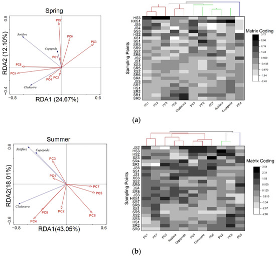 Plot of principal components with zooplankton redundancy analysis and clustering heatmap in different seasons: (a) Spring; (b) Summer; (c) Autumn; (d) Winter.