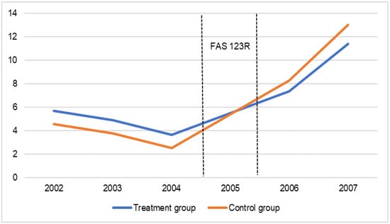 To identify the causal relationship between risk-taking incentives derived from CEOs’ stock options and bank EMGT, we employ Financial Accounting Standard (FAS) 123R, implemented in 2005. This is because FAS 123R requires firms to expense option compensation using the fair value method, thus, increasing the cost of granting options to employees [15,32]. In reaction to FAS 123R, firms significantly cut down on the use of stock options, which is the major contributor to compensation convexity, resulting in reduced risk-taking incentives [33,34]. Therefore, FAS 123R exogenously impacts CEO risk-taking incentives by imposing a negative shock to option compensation.