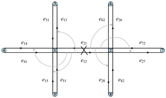 Step 3: The model then begins redistribution of the failed load. Considering the actual situation, that the driver is unable to quickly obtain all the information in the whole road network, the traffic volume on the failed road section should be preferentially shunted to the road section connected with the accident section according to certain rules. In addition, the section connected with the failure section is divided into two kinds. The first is the adjacent edge which is completely or approximately opposite to the direction of the failure edge; the second is the adjacent edge whose angle with the failure edge direction is less than or close to the right angle, as shown in Figure 2. Assuming that the edge is an invalid edge, the edge is the first kind of adjacent edge of the edge ; edge and edge are the second kinds of adjacent edges of the edge .