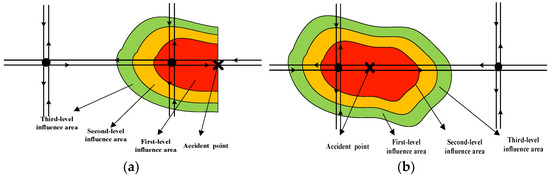 - According to Equation (19), the maximum influence distance is when the influence degree of the accident source point on the accident road is different levels (u = 1, 2, …N).