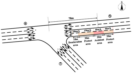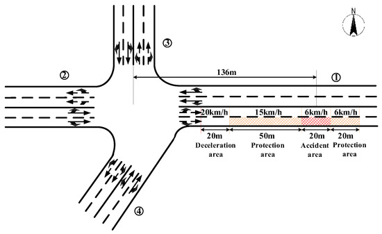 - Accident parameters: The accident occurred on the east exit road 136 m away from the intersection at 300 s, with an accident-occupied lanes proportion of 0.5 (the accident occupied the outermost lane), an accident duration of 1 h, and an accident length of 20 m. Therefore, the length of the closed lane (the length of the accident area) was set to 20 m; the deceleration zone was set to 0–50 m west of the accident location, and the lane speed near the accident area was 15 km/h; the two-lane speed at 50 m to 70 m west of the accident location was set to 20 km/h; the same-direction lane of the accident (length 20 m) and west 20 m, east 20 m (a total of 60 m) were all deceleration zones, where the speed was set to 6 km/h. After the accident treatment was completed, the deceleration zone was removed to achieve the purpose of evacuating the accident-queuing traffic. The specific schematic diagram is shown in Figure 6.