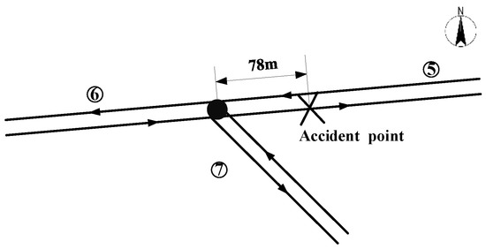 The accident occurred on a road that adopts the secondary highway standard, two-way four lanes, and the proportion of lanes occupied by the accident is 0.5. The road network diagram of the accident example (G108) is shown in Figure 7. And the accident section number is ⑤, and the upstream section number is ⑥. There is an intersecting road (road section ⑦) 78 m away from the accident location.