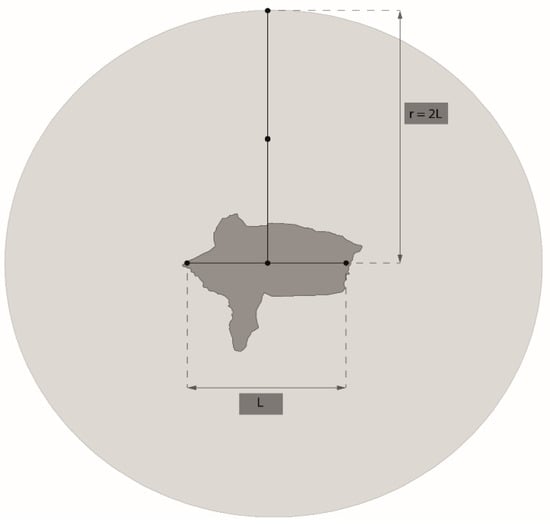 It is difficult to propose a single value for adapting this concept to the effect or influence of the landscape on agro-ecosystem components in terms of productivity, adaptability, or resilience, among other properties affected by agro-biodiversity. To simplify this, Leon-Sicard et al. (2018) and Leon-Sicard (2021) proposed defining a circle with a radius measuring the double of the longest side of the farm [12,15]. In all cases, this would permit having an extension of land proportional to the area of each farm and emphasize the importance and centrality of the agro-ecosystem in relation to the landscape. At the same time, it would permit defining a zone or area of influence over the farm and vice versa (Figure 1, Equations (1) and (2)).
