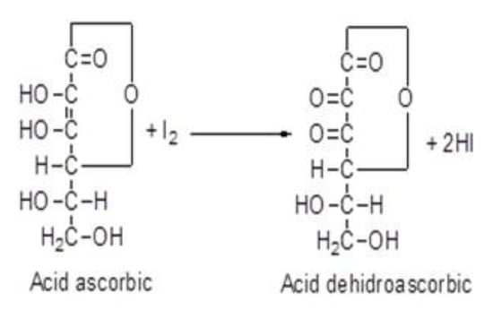 There are numerous methods which are used for the quantitative determination of vitamin C, such as the titrimetric–iodometric method [12], the 2,6 dichloro indophenol method [13], the voltametric methods [14,15], the spectrophotometric method [16], and the chromatographic method [17,18,19]. The simplest and fastest methods to analyze vitamin C is the titration method because it gives similar results to the spectrophotometric and the chromatographic methods [20]. This method allows the determination of vitamin C through a series of vegetal products with different complexities. However, the extractive processes must be performed with a high yield and in a short amount of time, in order to avoid the rapid oxidation of vitamin C. The iodometric method is a method used to determine the concentration of vitamin C, on the basis of its reductive properties, through redox titration using iodine as a result, due to the oxidation reaction of the ascorbic acid with excessive iodine [21]. As the iodine is added during the titration process, the ascorbic acid is oxidated and it becomes dehydroascorbic acid while the iodine is reduced to iodide ions (Figure 2). The method is based on the oxidation of ascorbic acid with excessive iodine, according to the reaction.