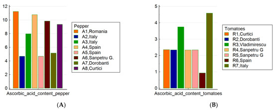 The content of vitamin C in the bell peppers and in the tomatoes, according to their origin (farmers or supermarket, Romania or other countries) is presented in Figure 3.