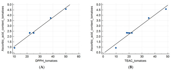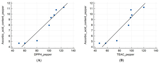 Furthermore, a post-hoc analysis was performed (Tukey’s test) which pointed out that the correlation of the vitamin C content with the antioxidant activity is significant for all of the analyzed samples (p < 0.01), and is more representative in the case of the bell peppers.