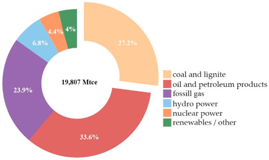 Georg Zachmann et al., in their study, emphasize that “almost three-quarters of the EU energy system relies on fossil fuels, where oil dominates the EU energy mix (with a share of 35%), followed by natural gas (24%) and coal (14%)” [9] (p. 10). The share of renewable energy sources (RES) has been increased in total but still plays a limited role (14%). In 2020, the European Commission (EC) predicted that, in 2030, fossil fuels will still contribute to half of the EU’s energy mix in 2030 [9].