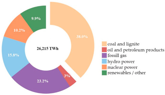 Data on the world’s total primary energy supply from 2018, represented in Figure 1, show that a large percentage of energy needs of the countries is satisfied by the use of fossil fuels (coal and lignite, oil, and gas). According to this diagram, the share of coal, as one of the primary significant components of the primary energy supply, amounts to 27.2%, and about 20% of EU power generation for the same year was based on the usage of coal [10]. Dong et al. stated that “about 55% of cumulative global carbon emissions originate from the power sector, and coal-fired generation accounts for more than 80%” [6] (p. 2), while, according to Cai et al., “GHG emissions from energy consumption reached 33.89 billion tons of CO2eq, with a 2.0% annual growth rate” [7] (p. 1). It is estimated that at least 80% of coal reserves must remain unused in order to prevent an increase in global temperature of more than 2 °C.