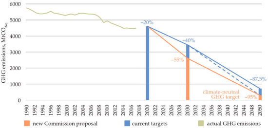 In order to participate, it is necessary to follow the fundamental aspects of climate neutrality, which are to reduce GHG emissions by 80–100% by 2050 or earlier, compared to the baseline year of 1990, or to achieve zero GHG emissions during a certain period in the future [2,5,14]. Future EU targets with GHG emissions for the period from 1990 to 2050 are shown in Figure 3.