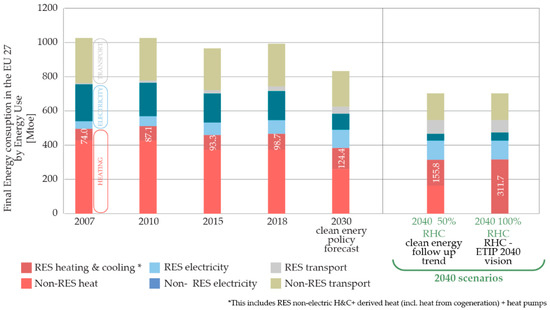 According to the European Commission plan, with an average increase of approximately 2.3% per year, an overall target of 32% of the RES share can be reached by 2030. By complementing the use of RES potential with the implementation of energy-efficient measures for the enhancement of the building sector, by 2040, the prediction is that about 50% of heating and cooling needs can be decarbonized, with the production of 155 Mtoe per year [21,22].