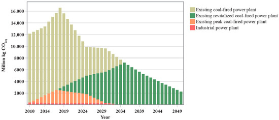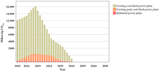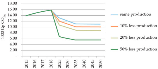 This shows how important it is to gradually close the existing CFPPs and replace them with new ones. That is why Figure 8 presents the potential for emission reduction if production decreases by 10% (red line), 20% (green line), and 50% (purple line) [32].