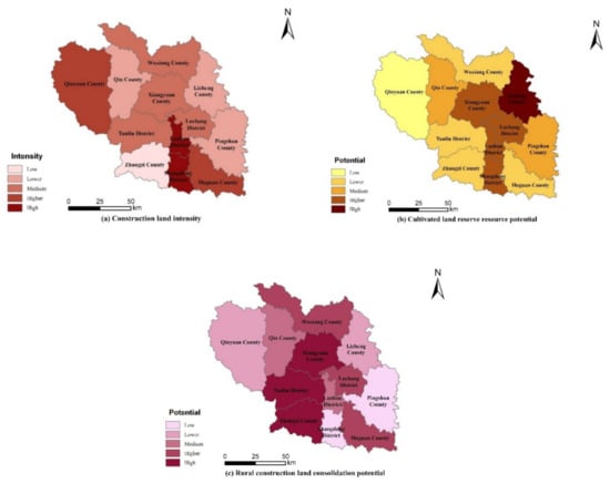 | Administrative District Name | Intensity of Construction Land | Cultivated Land Reserve Resource Potential | Rural Construction Land Consolidation Potential |
