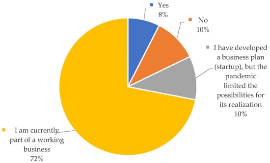 With the question “Before the pandemic (announced in Bulgaria on 12 March 2020) did you have an intention or business plan to start your own business?”, we aimed at identifying whether the respondents’ entrepreneurial initiative was thwarted by the pandemic, keeping in mind that all of them currently work or have their own business. However, 10% of them declared that they had a business plan, but the pandemic hindered its realization (Figure 2).