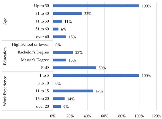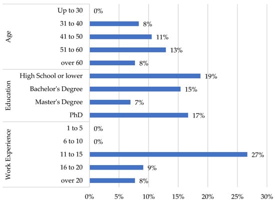Furthermore, there are numerous studies which focused on various demographic characteristics of the entrepreneurs, such as gender [32,33,34], age [32,33,34,35], education [32,34], work experience [31,32,34,35], family background [31,33], position [35], etc. In our study, we focused on the examination of demographic characteristics according to the availability of the data. These characteristics are age, education, and work experience. Therefore, the following hypothesis can be formulated: