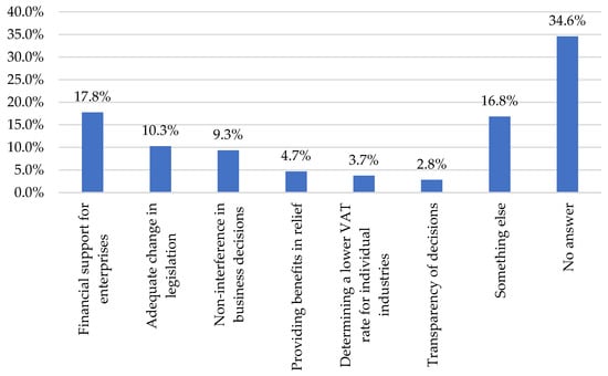 The third group of factors focus on the assessment of measures to support the business under the pandemic. First, we aimed at identifying whether the entrepreneurs benefited from any of the state’s programs (Q3. Which of the provided business and employee support measures are used in your organization?). Furthermore, we wanted to receive proposals from the respondents what else can be done to support them. Thus, we analyzed the answers of the following questions:
