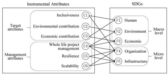 The categories C4-Whole-life project management, C5-Resilience, and C6-Scalability mainly contribute to the micro level of SDGs, named as management attributes. Among these three, C4-Whole-life project management is related to both the macro level (F2, F3) and micro level (F4, F5).