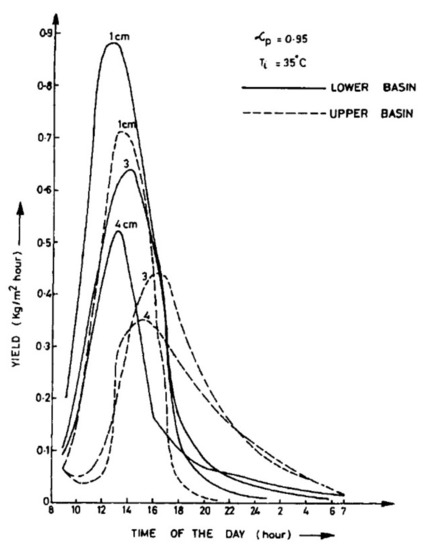 The lower basin water depth’s effect on the hourly variation of the total yield. Reprinted/adapted with permission from Ref. [8]. 2022, Elsevier.