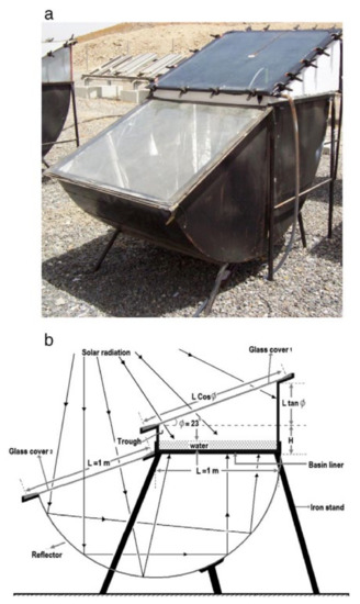 (a) A picture of the solar still with the inverted absorber (IASS). (b) An IASS schematic design. Reprinted/adapted with permission from Ref. [12]. 2022, Elsevier.