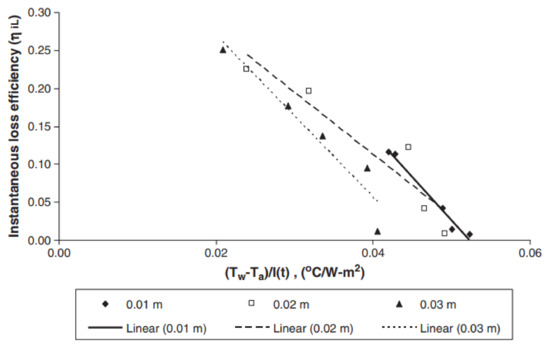 In 2011, Dev et al. [12] constructed linear and nonlinear characteristic correlations of the inverted absorber solar stills (IASS), considering analytical formulations of instantaneous gain I and loss (iL) efficiencies using experimental data for the climatic conditions in Muscat, Oman. Figure 6 displays an illustration and a layout of the experimental setup. The outcomes demonstrated that the IASS exhibits expected nonlinear behavior. These findings were also contrasted with equations specific to SS that were discovered in comparable operational and climatic circumstances. Figure 7 and Figure 8 show that the values of (instantaneous gain efficiency) increase as the water depth rises, whereas the values of instantaneous loss efficiency (iL) decrease as a result of the water’s thermal storage effect. Since 0.01 m water depth has been discovered to have superior values of I iL and ew than other water depths, it may be advised for solar stills.
