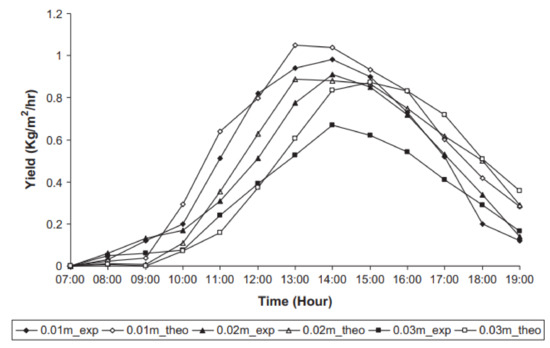 Water depth effect on the hourly variation of the double-basin inverted absorber solar still’s yield. Reprinted/adapted with permission from Ref. [5]. 2022, Elsevier.