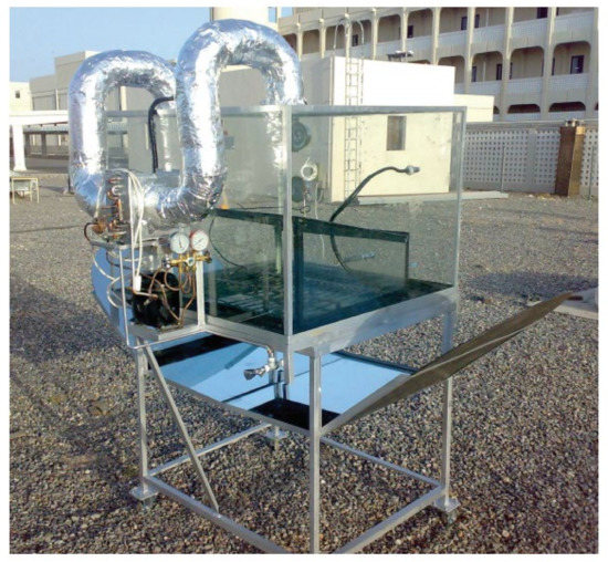 In 2012, Abdul-Wahab and Al-Hatmi [14] reported on an experimental study of an inverted solar still that was combined with a refrigeration cycle (Figure 10). Several feed saline water temperatures and water depths were used during the experiment. In Muscat, which is part of the Sultanate of Oman and has a climate typical of that area, experiments were conducted in the month of July. The daily production increased to 6670, 4940, and 3930 mL/day when the feed saline water was 35 °C. This is commensurate with the water depths of 8, 6, or 4 mm, respectively. However, when the feed saline water was 30 °C, it was discovered that the daily yields of distilled water generated were 9500, 10,080, and 6400 mL/day at water depths of 8, 6, and 4 mm, respectively. The results of this study were contrasted with those of previously published literature to better understand how effective solar stills may be. It was also found that the chilled inverted solar still could generate more potable water per day than the conventional inverted solar still, in contrast to the typical inverted solar still. Additionally, it was discovered that increasing the water depth could increase the daily production of the inverted refrigerated solar still, contrary to the conventional inverted solar still which exhibited the opposite behavior and where it was discovered that decreasing the water depth could increase the daily production.