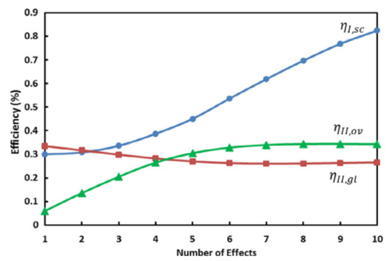 In 2018, an inverted absorber multi-effect solar still’s energy and exergetic analyses were investigated by Shanazari and Kalbasi [19]. A new benchmark for gauging the efficacy of the first law thermodynamics was created for multi-effect solar stills. Energy and exergy balance correlations were established for water basins, condensing surfaces, and absorber plates to assess the irreversibility of the various components. Results confirmed that when the number of impacts increases, less energy is lost via the absorber plate, water basins, and condensing covers in a particular basin. However, going from one to ten basins results in a 337% increase in the overall irreversibility of the water basins. Energy balance calculations revealed that when the impact rose from one to ten, the heat flow to the ambient environment was reduced by 74.8%, increasing the first law’s efficiency by 174.6%. Figure 12 demonstrates that while the global second efficiency decreased by 20.6%, the total yield, irreversibility, and overall second efficiency all increased with an increase in impact from one to ten.