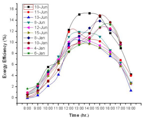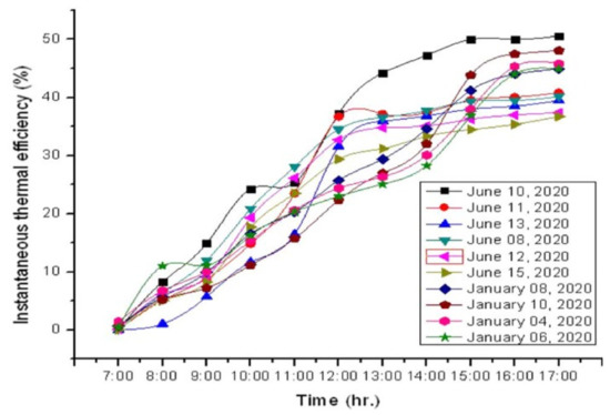 Hourly variations in experimental ηinst for specific days in June 2020. Reprinted/adapted with permission from Ref. [22]. 2022, Springer nature.