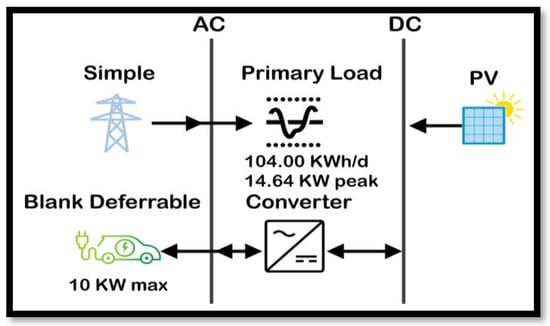 Low maintenance costs and sustainability characterize the solar photovoltaic (PV) system. During the load-shedding period, an individual in metropolitan areas uses the PV system to supply their electrical loads [11]. Pakistan has a huge potential for renewable energy, especially solar energy. The government of Pakistan (GOP) has made the net metering scheme available to the general civic population in response to the rising level of use of the PV system, allowing for the PV system’s contribution to the national grid. Therefore, the most likely method for charging EVs is solar PV power [12,13]. To create photovoltaic EV charging stations, extensive research has been done [14,15]. An EV charging model that examines the impact and capacity outline for various degrees of EV penetration using both conservative sources and solar PV are proposed in [16,17]. According to the analysis, the load is increased by 2% when 15 EVs are integrated, but by 7% when 50 EVs are used [18]. The optimization method that reduces the time and money spent on charging has been studied in [19]. A 24 kW PV array has been integrated into a DC bus via a unidirectional DC/DC converter with a maximum power point tracking (MPPT) controller [20]. The power of an EV charging station for solar PV and battery energy storage systems (BESS) was designed and managed in [21]. A solar charging station with battery reserve that has a solar PV module with a rated power of 280 W, a 12 V battery, and a 130 Ah capacity is discussed in [22]. The goal of the project is to offer an effective, zero-emission EV charging station in metropolitan areas [23]. A 48 V battery set and two 200 W solar panels are used to power an automated switching system-based solar battery charging station [24]. The goal of the project is to provide renewable energy to both urban and rural areas [25]. When there is doubt about RESs, the automated switching system can switch the power connection from RESs to battery backup. In [26], which focuses on forming multiple RES-based EV charging stations to provide a resourceful energy system, the viability of another solar-based EV charging station is demonstrated using HOMER Pro 3.14 software [27]. Numerous studies have been carried out to improve renewable resource-based EV charging productivity in light of the study above [28,29,30,31]. A deep reinforcement learning-based fast charging constraint is proposed by the author for the fast charging of EVs. In another manuscript, an artificial intelligence-based scheme is suggested by the author for the management and manufacturing strategies for the long life of batteries [32,33]. The paper discusses the technical and financial impact of the PV system. The PV system produces electricity and hydrogen at five different locations in India. The paper also finds the optimal configuration of the system at various locations [34].