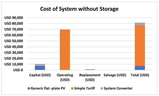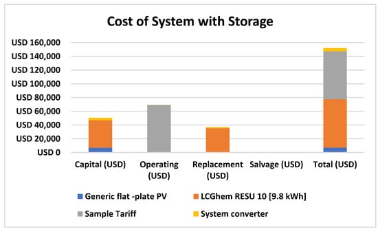 The capital cost for the storage system is USD 40,000, and the system has an operational cost of USD 64.64. Moreover, the system has a replacement cost of USD 35,338, and the salvage is −USD 4791. The total cost of the storage system reaches USD 70,611. The total cost of the simple tariff is USD 69,095. The system converter has a capital cost of USD 3500, with an operating cost of USD 12.93 and a replacement cost of USD 1485. The salvage cost is negative USD 279.48 for the converter, which is why the total cost of the converter is USD 4718. Collectively, the system has a capital cost of USD 50,416 and an operating cost of USD 69,198. The replacement cost of the system is USD 36,822, and the negative salvage cost is USD 5071. The overall cost of the system is USD 151,366. Figure 7 shows the cost analysis of the system with storage. The costs for the system are further explained in Table 4.