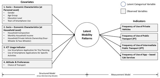 Since smartphone app usage is growing and affecting how people move, it is important to concentrate on gaining a better understanding of how smartphone app usage affects people’s everyday transport choices. However, the use of these apps and how they affect users’ mobility choices may differ across smartphone users, depending on their level of technology ownership, generational diversity, sociodemographic characteristics and preferences [19]. By examining how smartphone app usage affects people’s daily transport choices in a developing country, this study adds to the body of existing work. In this context, the study explores the following research questions: (1) What are the factors that significantly influence different transport choices of individuals due to their smartphone app usage? (2) What variations exist across the transport choices of different user groups? To address these questions, this study makes use of Latent Class Cluster Analysis (LCCA) to probabilistically classify smartphone users into groups with similar transport usage patterns, using a rich set of covariates, including socioeconomic characteristics, smartphone app usage patterns, and attitudes and preferences, while maximizing the diversity of these patterns between groups. Furthermore, the mentioned covariates have been discussed as factors affecting individuals’ probabilities of belonging to the latent clusters.