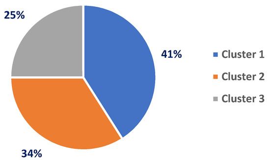 The three-class solution was chosen as the best, after analyzing several alternatives, based on the lower AIC and BIC information criterion values. Out of all the samples, 41% were classified in Cluster 1, 34% in Cluster 2 and the remaining 25% in Cluster 3 (Figure 2).