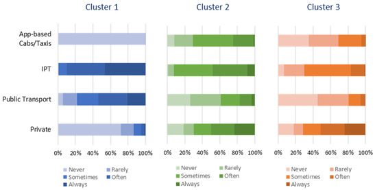 - The Multimodal Travelers cluster included respondents who chose to travel with various transport modes depending upon their requirements. It primarily comprised highly educated younger users belonging to medium- and high-income households. They had extensive experience with the use of smartphones and showed a very high dependence on app usage for their transport needs. They often compared the different travel options available to them, including the combination of modes for their trips, and were even willing to try new mobility choices. Even though they were slightly uncomfortable with the prospect of riding with strangers and the cleanliness of public transport was a concern to them, they acknowledged that the use of public transport was essential for preserving the environment and were very open to the idea of shared mobility where they could get the convenience of a private vehicle without the need to own them. These socioeconomic traits have also been observed among early adopters of shared forms of transportation [49,74,75,76], as well as generally among multimodal individuals. Additionally, it was observed that individuals in this cluster more frequently chose their mode of transportation based on trip information rather than just their preferred or regular means of transportation. As a matter of fact, some research shows that multimodal individuals have more complex strategies for choosing transport options, and they possess weaker travel habits [77]. In turn, this makes it easier to implement innovative mobility solutions such as MaaS.
