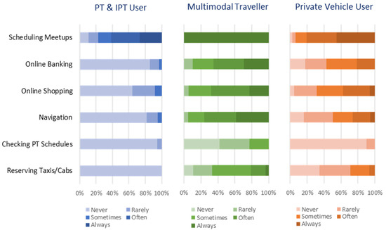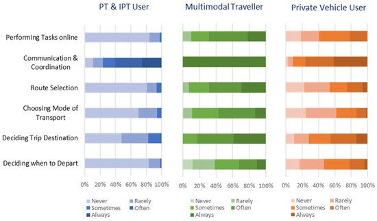 - PT and IPT Users: As stated, respondents showed a high dependence on communication and coordination, as most stated that they “Always” or “Often” use them. Most respondents stated that they never used smartphone apps to decide when to depart, choose a mode of transport, make route selections and perform tasks online. In comparison, a relatively higher proportion of users stated that they used apps to decide trip destinations on rare occasions.