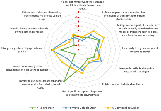 Respondents who compared travel options, chose the mode of transport per their travel needs and were willing to try new travel modes had a very high probability of being clustered as multimodal travelers who also highly rated multimodality. As per the responses, these users had a high probability of being pro-environment, felt a little uncomfortable riding with strangers and were most likely to reduce their car dependence if a cheaper alternative was provided, preferably something that could provide the convenience of a car without owning one. They gave some consideration to reducing trip costs by using public transport and shared mobility services. However, if a respondent was highly cost-sensitive, there was a high probability of being classified as a PT and IPT user who had the most stated disagreement with all the statements. The users who were more inclined towards vehicle ownership, less comfortable with public transport and moderately willing to try new services, had a high probability of getting classified as private vehicle users.