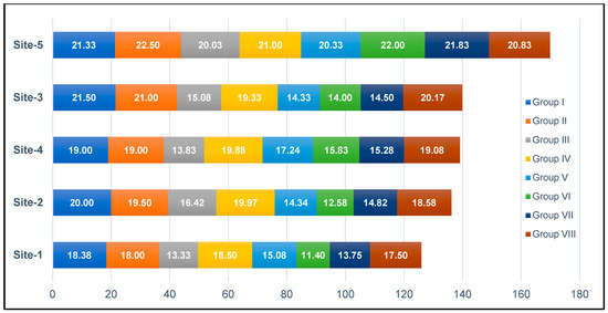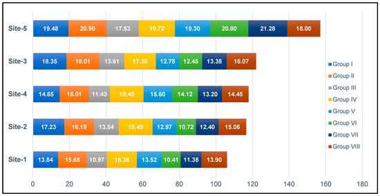 As follows from the second data analysis using the BCC-I model of the DEA method and based on the results presented in Figure 2, all of the evaluated information and shopping websites were characterized by a relatively higher level of information usefulness efficiency than in the case of the CCR-I model. The range of obtained values for individual services varied in the range from 74 to 100%, the ideal rating value, obtained by the best-rated website in the opinion of the respondents. The best website in the ranking in terms of the information usefulness efficiency level turned out to be, again, website 5 (Site-5), which obtained the summary evaluation result of all groups of criteria at the level of 16,987 points (100%), and at the same time it was recognized as a pattern (the so-called benchmark) for other services. The second place, with a score of 13,992 points (82%), was taken again by website 3 (Site-3), which was only slightly ahead of the third site in the ranking, website 4 (Site-4), which obtained the score of 139,15 points (82%). Website 2 (Site-2) was in fourth position once again with a slightly lower score of 136,21 points (80%). The last in the ranking turned out to be, again, website 1 (Site-1), with a score at of 12,594 points (74%), which obtained the lowest scores in almost all groups of criteria once more (except for group number 5).