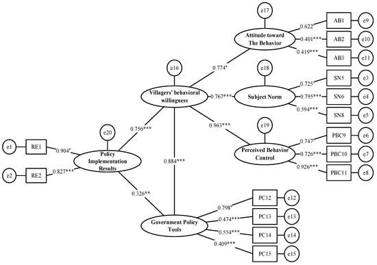 This study used SPSS22.0 to analyze the reliability of the latent variables of farmers’ willingness behavior, government policy instruments, and policy implementation results. The results of the reliability test were mainly reflected by the Cronbach’s α coefficients. Nunnally mentioned that the Cronbach’s α coefficient value required for exploratory research is α > 0.6; whereas, for confirmatory research α > 0.7 is required, and an overall reliability coefficient above 0.7 is acceptable. The reliability coefficient of the subscale is above 0.6, which is acceptable [57]. In this study, the overall Cronbach’s α coefficient of the questionnaire was 0.898; the overall Cronbach’s α coefficient of the farmer’s questionnaire was 0.884; and the α coefficient of the overall Cronbach’s of the government’s questionnaire was 0.640. The Cronbach’s α coefficients of each latent variable were good. The scale passed the reliability test. The KMO value of the questionnaire validity test was 0.908, the value of the Bartlett ball test was 1881.402, and the significance level was 0.000. The KMO value of the questionnaire validity test for government actors was 0.700, the value of Bartlett ball test was 176.077, the significance level is 0.000, and the validity of the scale passed the test (Table 5).