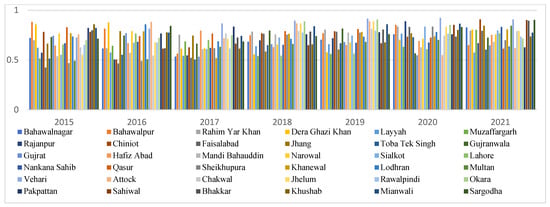 Using Table 2, we can see how well the WEF nexus worked in different districts of Punjab. The “real” input–output efficiency was dominated by management efficiency after removing social, economic, and waste disposal impacts and statistical noise. Table 2 shows that, between 2015 and 2021, the WEF nexus’s management efficiency in Punjab’s local units increased rapidly. The Punjab’s average went from a value of 0.68 in 2015 to a value of 0.76 in 2021. Figure 1 also depicts the efficiency scores of the Punjab districts over the time period. Figure 3 shows the variation in the efficiency of the districts of Punjab over the time period. The details of Table 2 and Figure 3 are given in the coming sections.